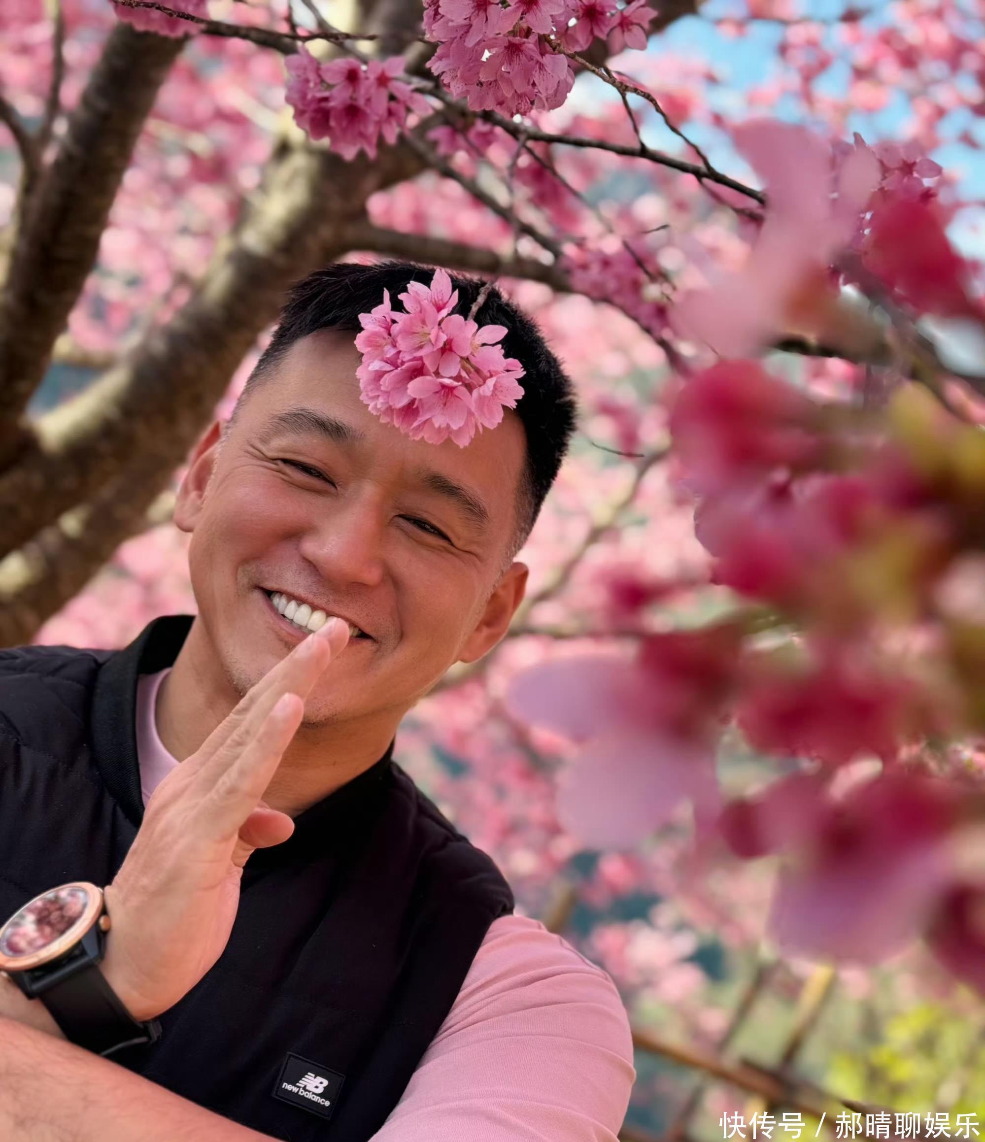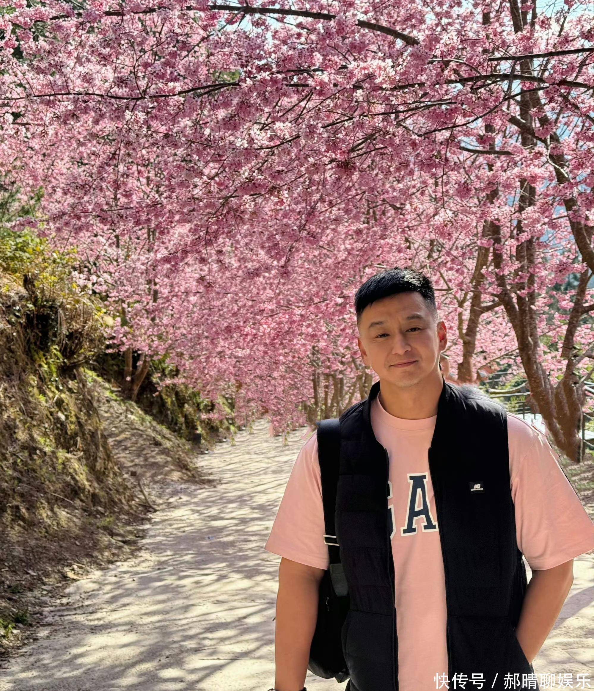 她晒出了多张照片。照片中,她老公身穿一件粉色短袖T,外搭黑色羽绒马甲,下搭牛仔裤,一脸幸福样。
