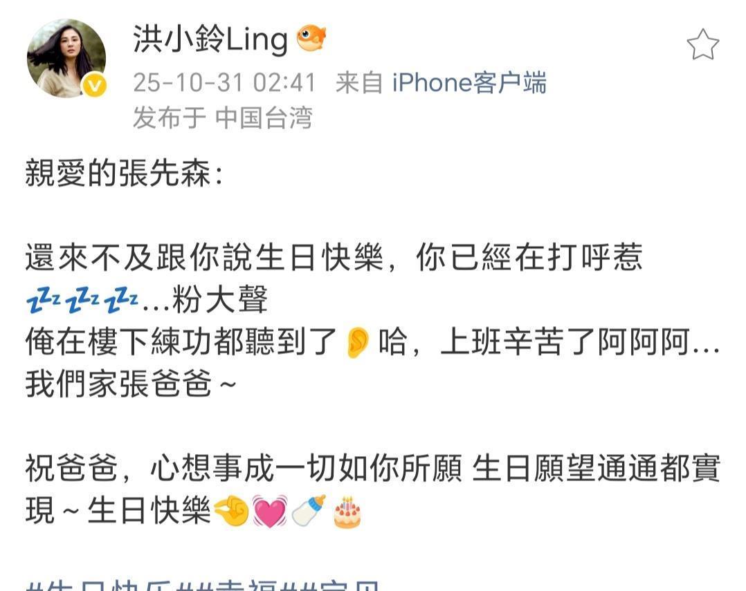 她写道“亲爱的张先生:还来不及跟你说生日快乐,你已经在打呼惹……俺在楼下练功都听到了哈,上班辛苦了阿阿阿……我们家张爸爸~祝爸爸心想事成,一切如你所愿,生日愿望通通都实现~生日快乐”。